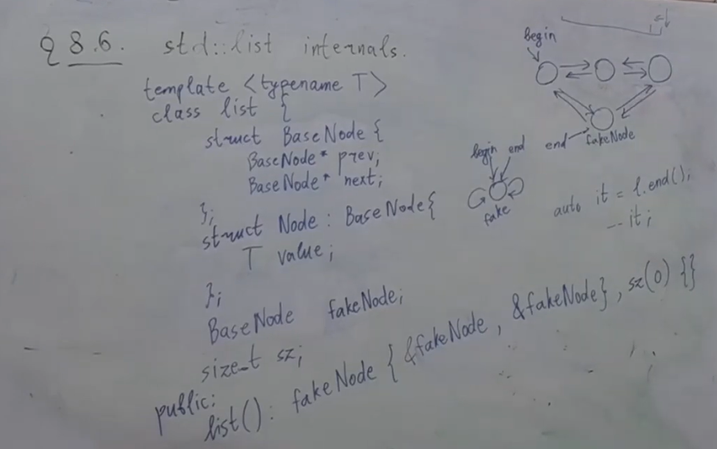 в std::list, как в std::map - под итератором на end() - фейковая нода. в фейковой ноде нет value и она связана с begin и end-1. в пустом листе одна фейковая нода (begin == end == fakenode)