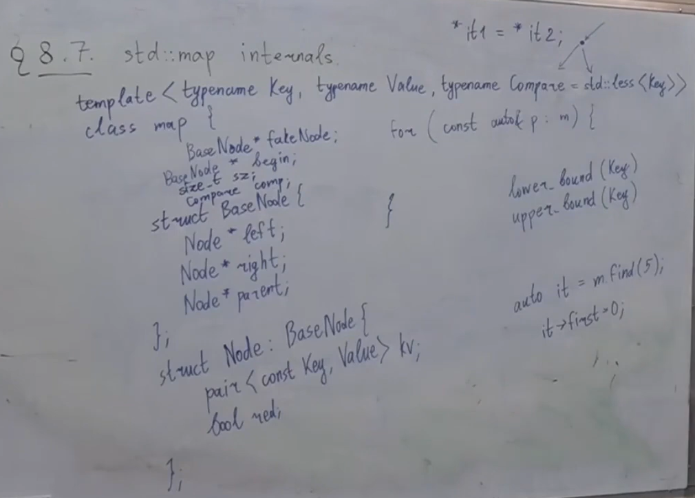 - equal_range(key) - возвращает пару итераторов на lower_bound и upper_bound - один спуск по дереву