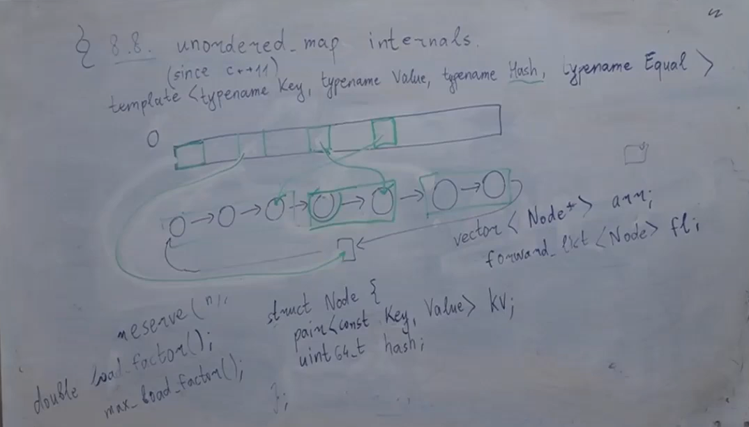 - rehash: последовательный erase и insert по новому хешу (работает за O(n), но худший случай O(n^2) - если был один огромный бакет на n). не создаём новые пары ключ-значение => не инвалидируем указатели и ссылки на элементы. итераторы инвалидируются (почему в стандарте так написано - большой вопрос, но по факту под итератором просто рандомная нода). при рехеше не происходит вызов std::hash. тк мы помним все хеши в нодах, то мы просто берём индекс ячейки по новому модулю в msvc хранится двусвязный список, позволяющий делать erase безболезненно