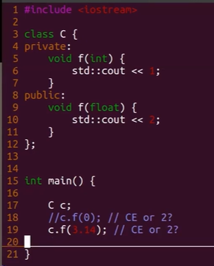 - CE, так как вызывается от double, а его равнозначно конвертить и в int и в float => неоднозначная перегрузка