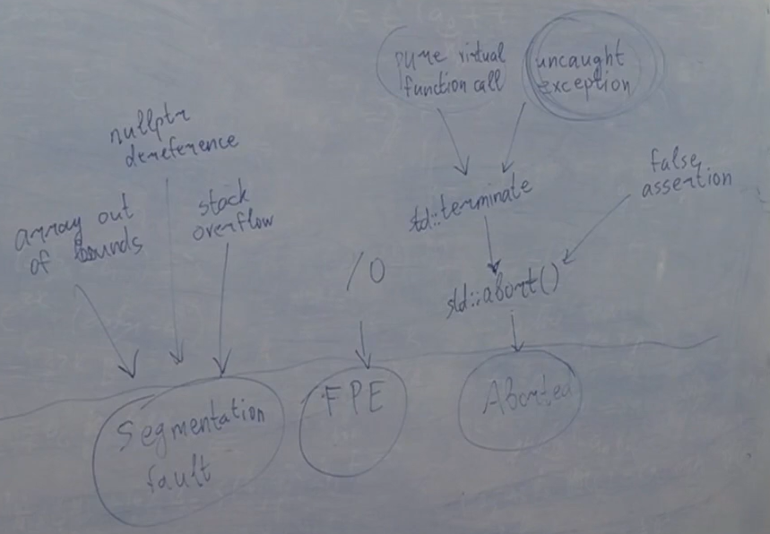 RE (Runtime errors) Segmentation fault (нарушение прав доступа) - ошибка, которая возникает, когда обращаемся не к своей памяти (если программа по отношению к ОС совершает недопустимую операцию, то ОС её убивает) Floating point exception (FPE) - возникает в процессоре, деление на 0 в целых числах Не удалось открыть файл, не удалось выделить память. throw Aborted - аварийно завершается операционной системой. Вызывается другими функциями стандартной библиотеки, если что-то пошло не так. Сишная функция abort(). код выхода implementation defined std::terminate() => std::abort()