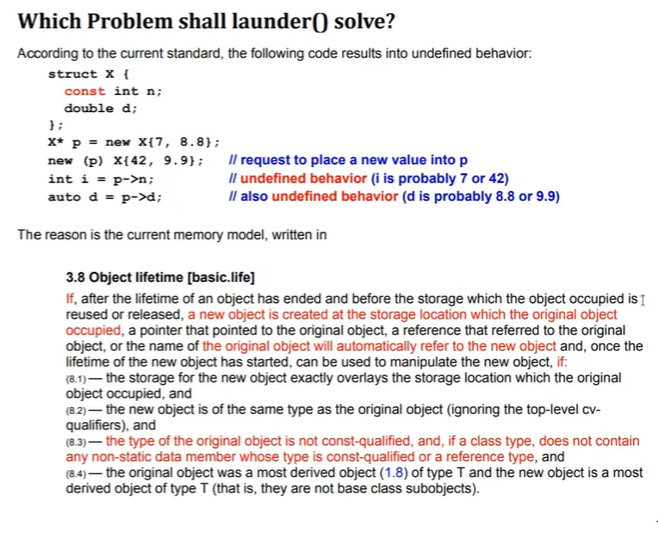 крч если мы собираемся на месте, где раньше лежал тип положить другой тип (или если раньше лежал константный объект), то нужно сделать не placement new на это место, а placement new на std::launder от этого места