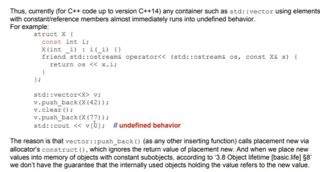 это было введено, потому что был замечен баг: при пуше и попе в std::vector константных объектов или объектов с константными полями происходило UB. тк компилятор имеел право предполагать, что тип не поменялся, но потом туда std::launder засунули в C++17