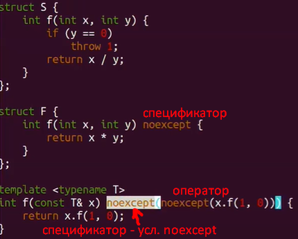 есть спецификатор noexcept, который мы пишем справа от сигнатуры функции, чтобы пометить, что функция не бросает исключения (чтоб компилятор смог оптимизировать, и если всё таки вылетит exception из noexcept - RE)
