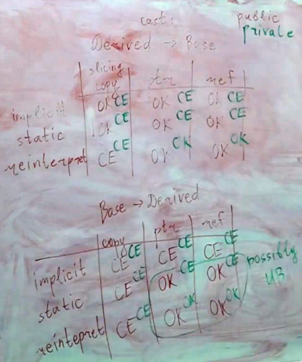 - каст вниз при виртуальном наследовании, предок полиморфный (CE, норм, UB)