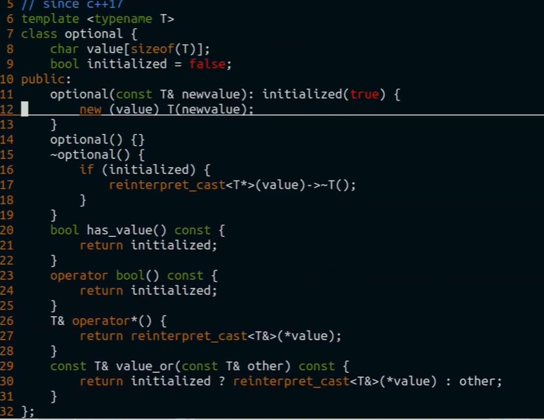 хранит массив чаров sizeof(T) и bool. хранит на стеке