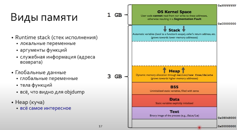 почему стек называется стеком? потому что чем глубже в функциях, тем ниже (ближе к 0) будет адрес локальных переменных почему куча нызвается кучей? куча это что-то неупорядоченное, откуда можно брать и отдавать (не имеет ничего общего с структурой данных) переполнение стека хуже переполнения кучи (sigsegv > null от malloc)
