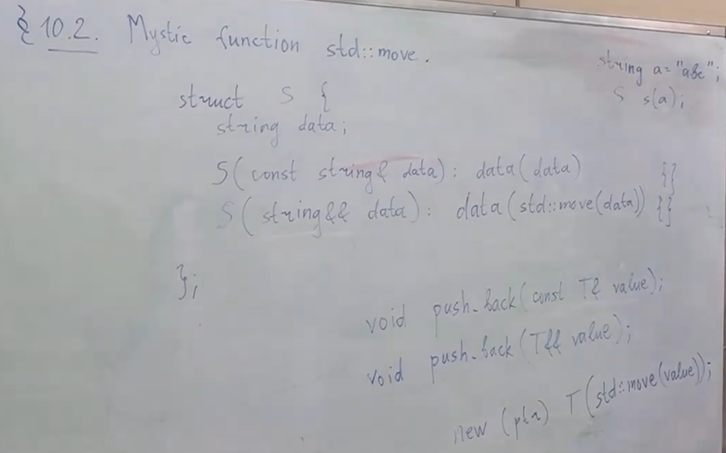 когда вызываются мувающие операции, а когда копирующие операции? при вызове от rvalue - мувающие, от lvalue - копирующие, но можно заставить компилятор вызвать мувающую операцию - для этого есть std::move - функция, позволяющая вызвать мувающие операции от lvalue