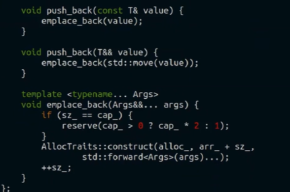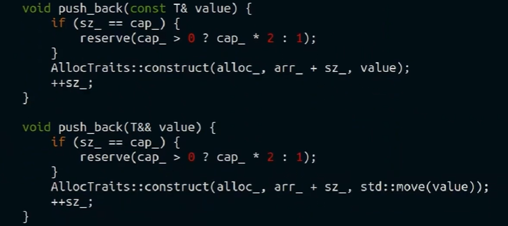 проблема: как пушбечить в вектор, если мы хотим мувнуть объект, но в векторе аллокатор вызывает конструктор в векторе от const T&, что создает копирование? конструктор от T&& не поможет, тк у объекта есть аргументы (const Args&… args), которым нужно сохранить тип value