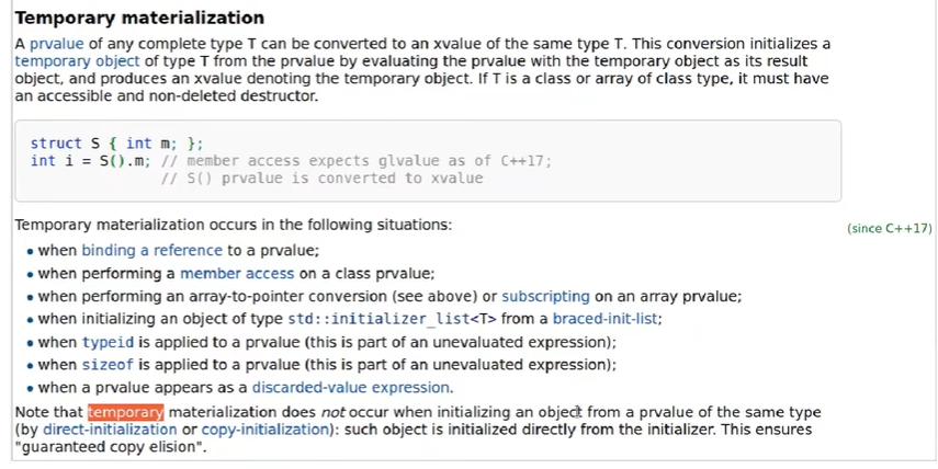 temporary materialization (с C++17 из-за guaranteed copy elision) (материализация временного) - неявное преобразование из prvalue в xvalue, которое происходит в ограниченном наборе случаев