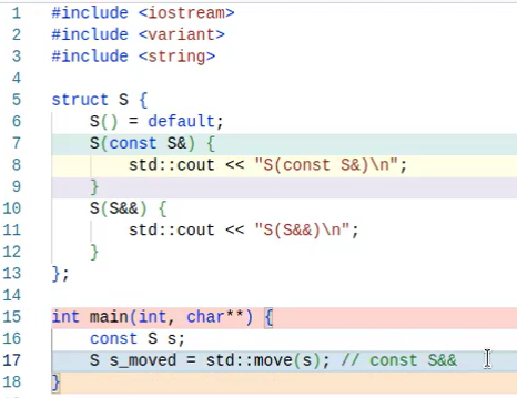 компилятор имеет право не класть в память prvalue - промежуточные объекты с C++17 компиляторы обязаны не создавать промежуточные объекты из prvalue - guaranteed copy elision