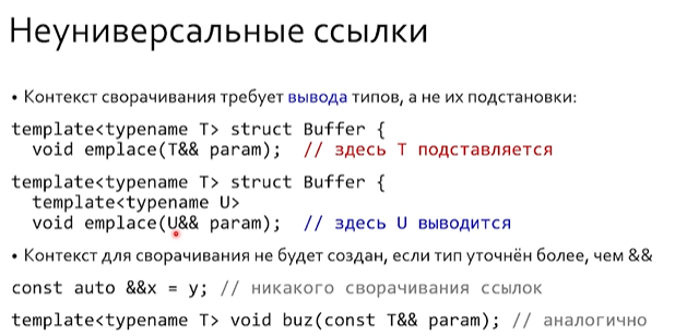 эти 2 условия верны всегда, кроме случая, когда rvalue& от T является типом аргумента шаблонной функции от T если функция принимает тип вида T&&, где T - это шаблонный параметр данной функции, то такая ссылка работает по иным правилам, нежели обычная rvalue& и называется универсальной ссылкой (forwarding reference) именно T&&, не const T&&, не vector<T&&>