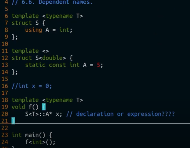 если в шаблоне есть имя, которое в неймспейсе шаблона, то он в любом случае парсит его, как expression, а не как имя типа. чтобы он парсил его как имя типа, нужно перед зависимым именем написать typename