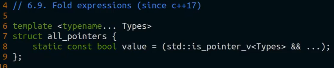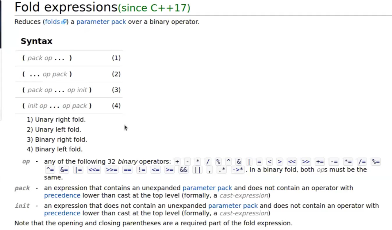 fold expression - expression, в котором фигурирует пакет и бинарным оператором соединяем с многоточием. разворачивается в compile time. означает: для всех типов из пакета повтори вот эту операцию