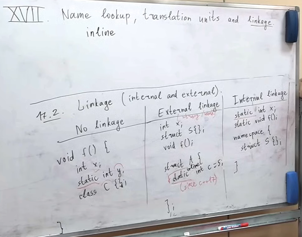 external linkage: “то, что торчит наружу из translation unit’a” глобальные переменные, классы, объявления глобально или внутри неймспейса, функции, статические поля и все методы классов - линковщик их видит как имя, торчащее наружу они все если объявлены, но не инициализированы, инициализируются по дефолту: obj{} для всех имён с external linkage есть ещё lanuage linkage - C-linkage (для коннекта с другими языками) и C++-linkage