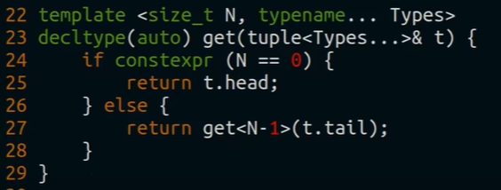 std::get - внешняя шаблонная функция, принимающая tuple как аргумент, а шаблонный параметр - constexpr число (индекс элемента tuple) через std::get можно также обратится к std::array и std::variant возвращаемый тип - decltype(auto). достает k-ый элемент и возвращает его если const tuple, то и возвращаемый элемент должен быть const аналогично с видом value