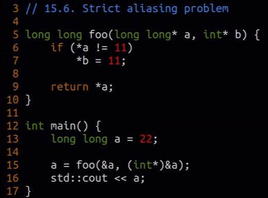 если заменить int на char, то UB не будет а ещё можно оставить int, но написать volatile перед long long (будет 11) volatile - квалификатор типа, синтаксически ведет себя как const, неявный каст к нему разрешен, обратно - нет запрещает компилятору оптимизировать обращения к этой перменной заставляет компилятор всегда проверять, чему равна эта переменная, даже если ему кажется, что она не могла поменяться между двумя её последовательными чтениями здесь костыль, чтоб починить UB. нужно просто strict aliasing не нарушать с C++20 не рекомендуется так писать однако в микроконтроллерах часто используется, где переменные изменяются из-вне