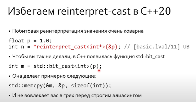 - std::bit_cast (C++20) - делает memcpy из одного типа в другой. размеры типов должны совпадать и типы должны быть trivially copyable. не нарушает strict aliasing, так как создаёт новый объект, а не просто переинтерпретирует память.
