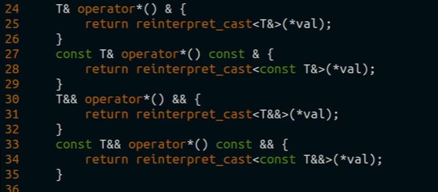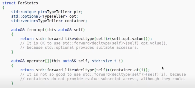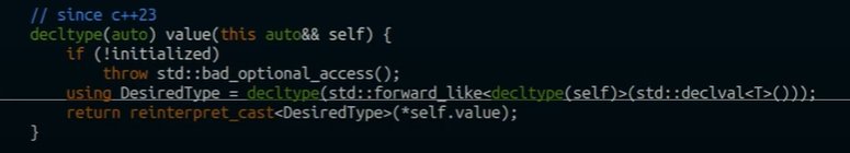 решение deducing this (С++23) с C++23 можно принять первый аргумент (себя же) явно. это позволяет сказать нам по какой ссылке мы this принимаем. таким образом мы можем не делать перегрузку методов, которые отличаются видом ссылки объекта this то есть мы будем возвращать в методе константное/неконстантное значение в зависимости от того объект, у которого вызывался этот метод константный/неконстантный используется в std::optional можно использовать для определения метода [] в своих контейнерах