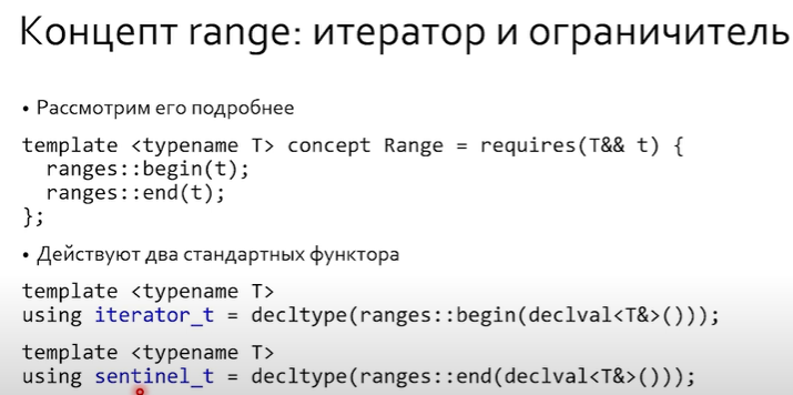 range - некий концепт, который удовлетворяет свойствам, что у него его begin и end + они работают за константу и begin гарантирует такой же результат при повторном проходе