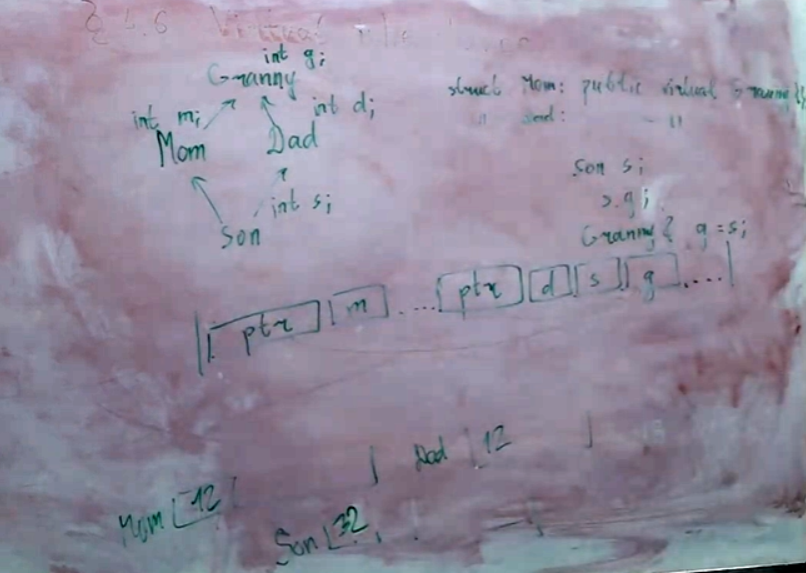 отличие виртуального наследования от обычного наследования полиморфных объектов: при обычном наследовании указатели на vtable складываются перед наследником, сколько виртуальных предков, столько и поинтеров перед ним при виртуальном наследовании у нас всегда поинтер один, а в vtable хранятся все сдвиги, общий предок кладётся после наследника